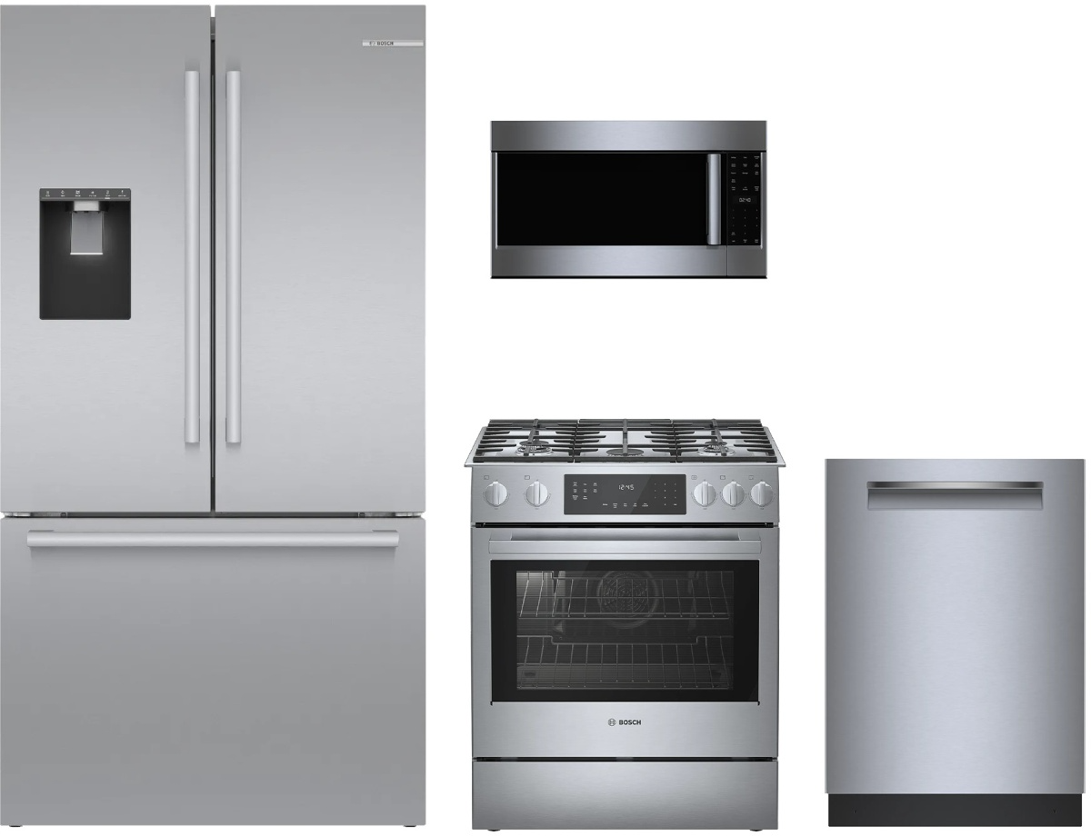 Bosch 4 Piece Stainless Steel Kitchen Package with French door refrigerator, built in dishwasher, slide in gas range and over the range microwave.Read More