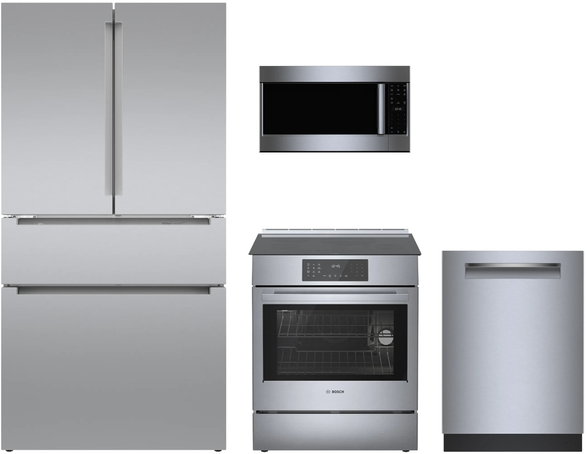 Bosch 4 Piece Stainless Steel Kitchen Package with French door refrigerator, built in dishwasher, slide in induction range and over the range microwave.Read More