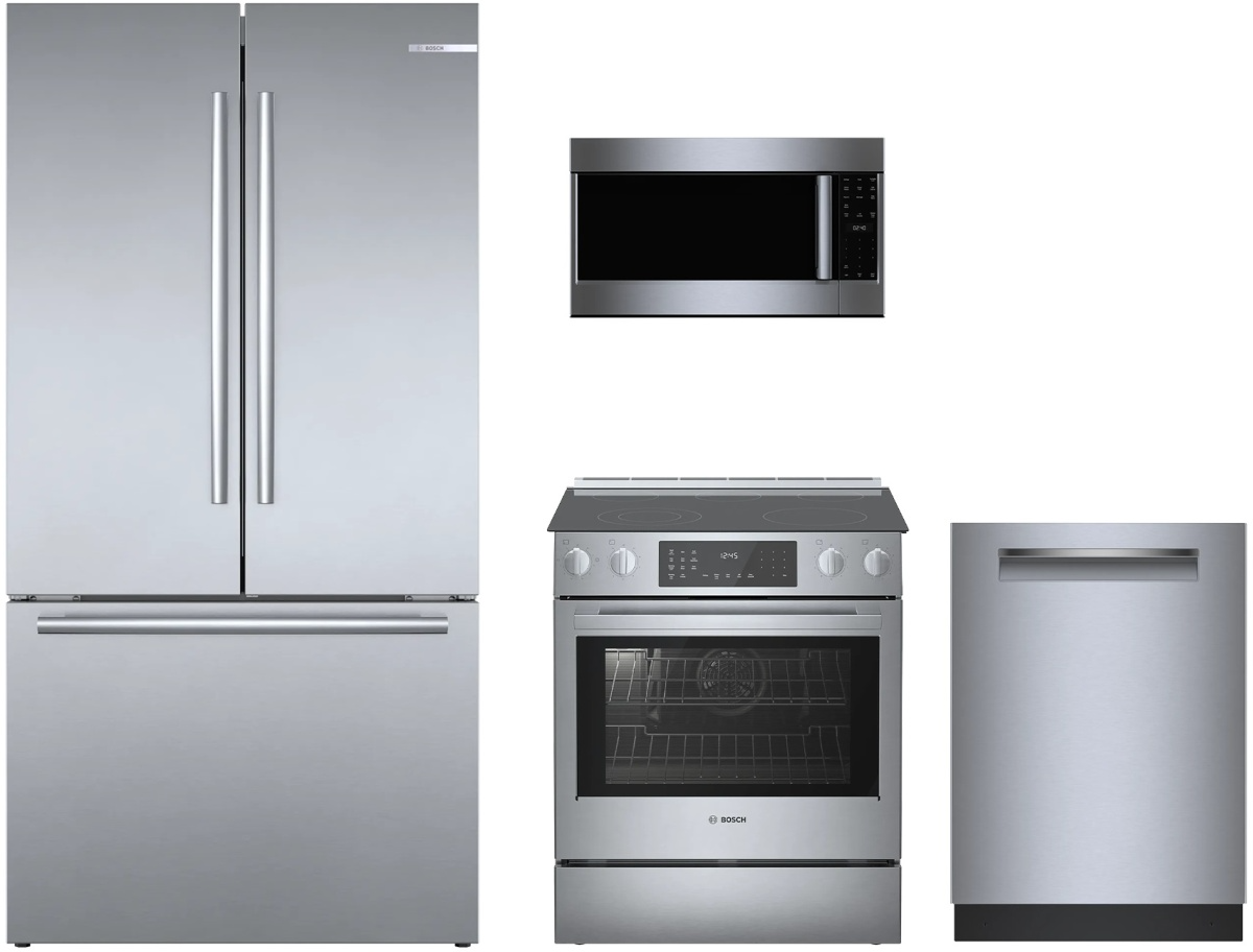 Bosch 4 Piece Stainless Steel Kitchen Package with French door refrigerator, built in dishwasher, slide in electric range and over the range microwave.Read More