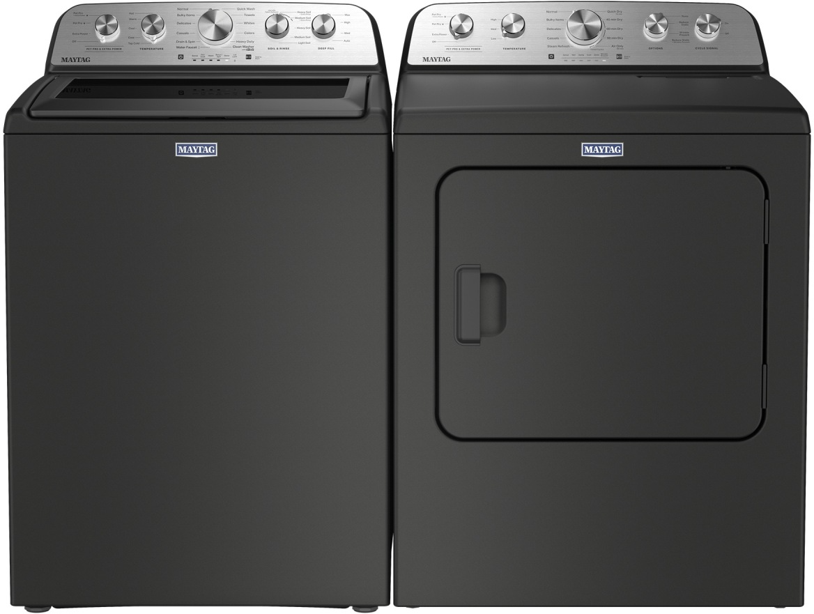 Maytag® Volcano Black Laundry Pair with 4.8 Cu. Ft. top load washer and 7 Cu. Ft. gas dryer with pet pro option.Read More